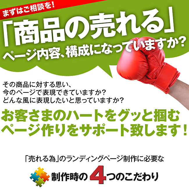 売れるノウハウを詰め込んだクオリティの高いランディングページ制作(商品ページ制作)を行います。また、数千ページもの楽天市場、ヤフーショッピング等のランディングページ制作(商品ページ制作)、の制作実績がありますので安心してお任せください。ランディングページ制作(商品ページ制作)をする場合、最初に熟練のディレクターとランディングページのデザイン、内容の打合せをして頂き、その打合せに沿ったランディングページ制作(商品ページ制作)を行います。 |